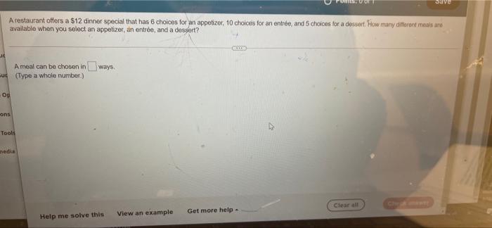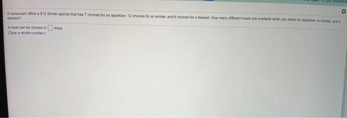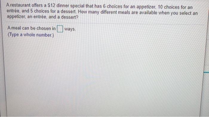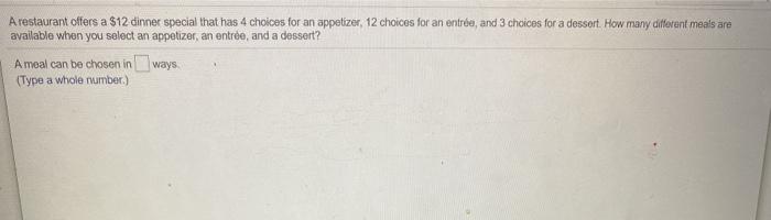 A restaurant offers a $12 dinner special. How many different meals are available when you select an. Correct answer - A restaurant offers a 12 dinner special that has 6 choices for an appetizer 13 choices for an entrée and 5 choices for a dessert. A meal can be chosen in Type a whole number.